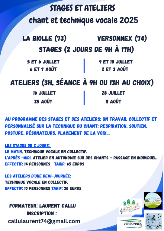 Un travail collectif et personnalisé sur la technique du chant: respiration, soutien, posture, résonateurs, placement de la voix.