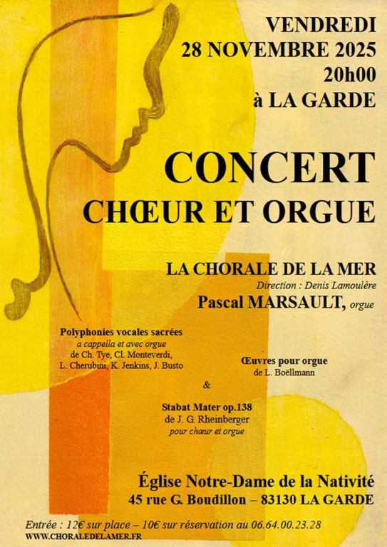 Le vendredi 28 novembre 2025 à 20h00 en l'église ND de la Nativité, la Chorale de la Mer dirigée par D. Lamoulère et P. Marsault à l'orgue donnent un concert.