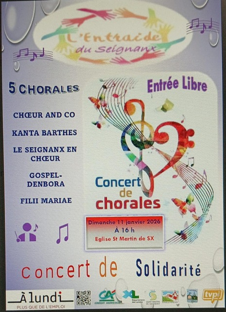 Choeur and co chantera le dimanche 11 janvier 2026 à 16h à l'église de SaintMartin de Seignanx avec quatre autres chorales: Kanta Barthes, le Seignanx en choeur, Gospel Denbora et Filii Mariae.