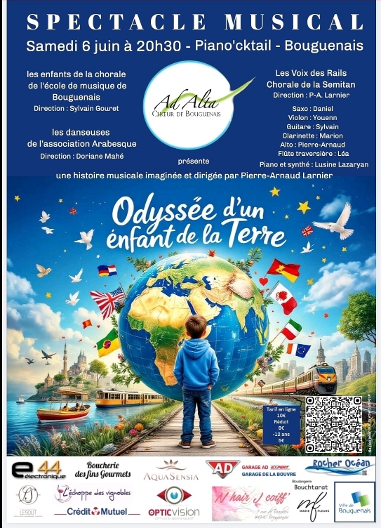 Le 6 juin 2026, AD ALTA Choeur de Bouguenais présentera " L'Odyssée d'un enfant de la Terre" , un spectacle musical original conçu et dirigé par Pierre-Arnaud Larnier, mêlant voyage imaginaire, cultures et musiques du monde. Ce récit suit le parcours symbolique d'un enfant découvrant des terres lointaines, guidé par des chants, des rythmes et des rencontres.
