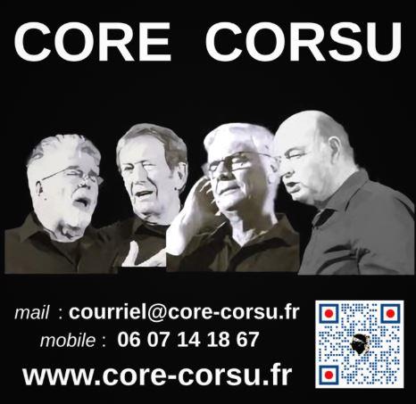 Le groupe vocal CORE CORSU, est connu pour ces fameux chants des villages de la montagne corse, et " la Paghjella", montrant l'âme de la Corse.Les voix du groupe CORE CORSU, s'élèvent 'a cappella', pour le plaisir de tous. CORE CORSU garde comme un trésor ces chants si particuliers, avec ces voix qui s'enchevêtrent, fusionnent, et dont s'échappent ces sons si particuliers. Un moment de grâce....