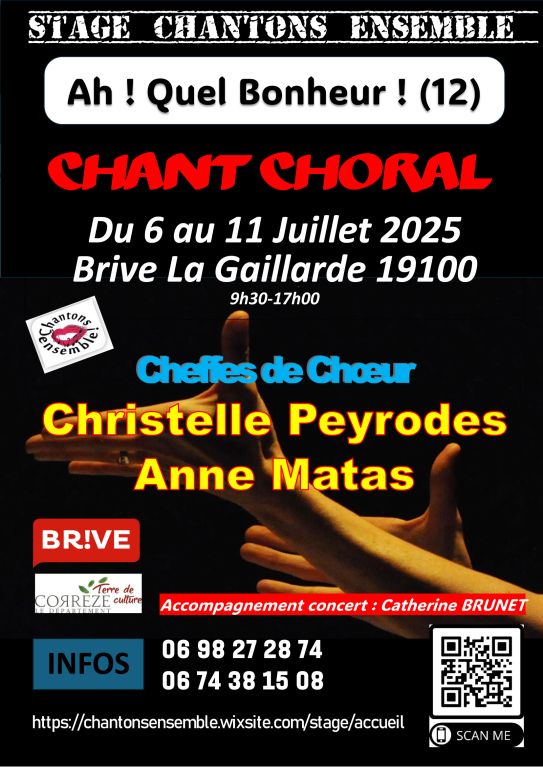 Voilà ce que vous promettent, pour la dixième année, Christelle Peyrodes et Anne matas, deux chefs de chœur passionnées et passionnantes ( ou pleines d’énergie ?) durant leur stage de chant choral du 9 au 14 Juillet 2023 à Brive la Gaillarde.