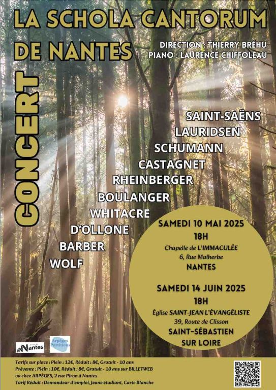 La SCHOLA CANTORUM DE NANTES est une formation de plus de 70 chanteurs amateurs recrutés sur audition et réunis par le même désir de qualité et de partage musical. Elle monte en moyenne 3 programmes différents sur une saison et aborde un répertoire varié d’œuvres principalement classiques : œuvres sacrées, chœurs d’opéra, etc, dans le souci permanent de l'exactitude stylistique et de la qualité vocale.