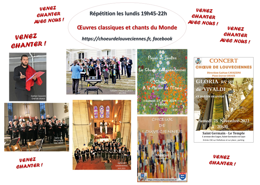 Nous travaillons une fois par semaine, davantage en période de concerts, sous la direction de notre chef de chœur dans une salle municipale de Louveciennes. Nous donnons un concert par an dans notre ville et chantons régulièremant dans les communes voisines ainsi que dans nos villes jumelles jadis Radlett en Angleterre et toujours Meersburg en Allemagne. Par nos concerts nous prenons une part active à la vie culturelle de notre ville et de notre région.