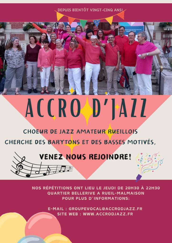 Groupe vocal au répertoire jazzy.Accro d'Jazz est un ensemble polyphonique formé d'amateurs passionnés de Jazz et de Swing. Notre répertoire est composé de standards américains du jazz, mais aussi de jazz français (Nougaro, TSF...). Nous nous produisons plusieurs fois par an.