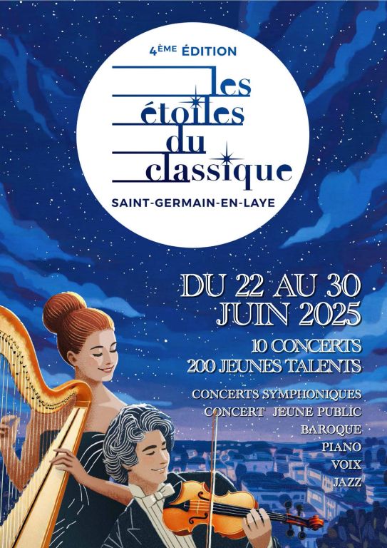 Festival de musique Classique à St Germain en Laye 10 concerts 200 artistesSuite au succès de sa troisième Edition, le Festival revient à Saint-Germain en laye pour 6 jours de concerts exceptionnels, les 22-et 26 au 30 Juin 2025. Le Directeur artistique Thomas Lefort réunit de jeunes musiciens de très grands talent qui s'exprimeront dans des cadres prestigieux le théâtre Alexandre Dumas et l'Eglise St Germain.